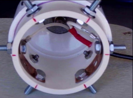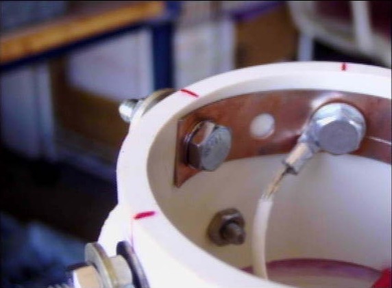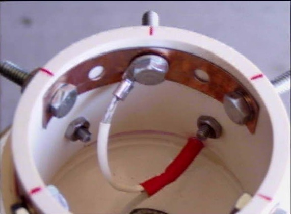 Notice the 4 screws that lock the 2 PVC units together. Also note the terminal eyes attached on the center bolt of each copper strip. Note the heat shrink I put on both the coax leads.