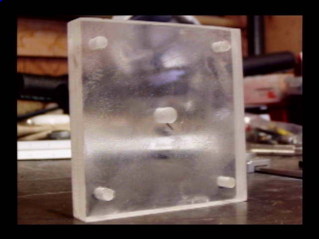 The material I use is Plexiglas, and I use acetone to stick them together. If you use Lexan, then Super Glue works great. After glue has dried, cut finished size to approx 7" by 7" and sand all sides to a smooth finish,