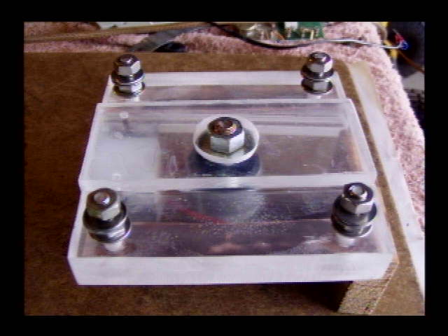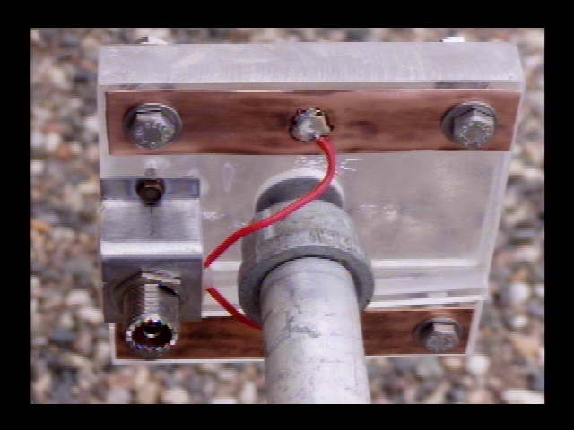 Note the block of Plexiglas, glued to the center of the top of the platform. This separates the set of bolts that are fed by the center of the coax, from the bolts fed by the shield side of the coax. This finishes out the platform, and should eliminate possible moisture related problems.