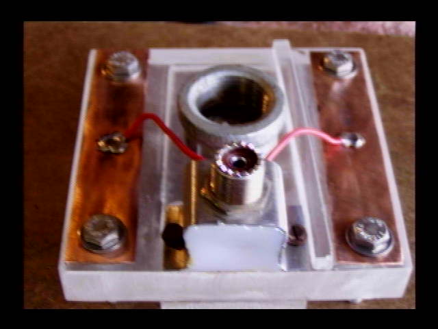 You may notice that after I mounted the SO-239 bracket to the platform, I sealed the cavity of the SO-239with hot glue. I did this to eliminate moisture causing possible problems should there be rain during the usage of antenna. If you look closely, you will also notice the small 1/4" by 1/4” Plexiglas strip that I glued to the platform base between the copper strap that carries the center coax lead, and the frame of the SO-239, or shield side. This further eliminates possible problems, should water be present during operation.