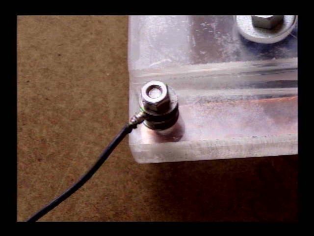 Another view of the Plexiglas strip. Note the sealing of the SO-239 assembly by the application of hot glue