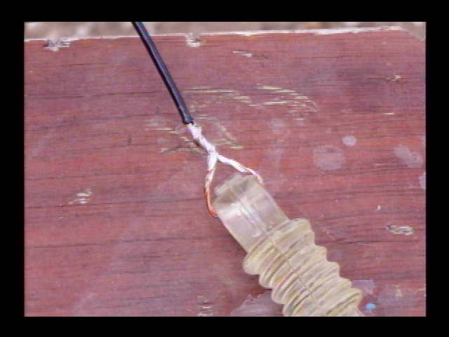 Should the builder not want to go to the trouble of mounting an SO-239, drill another 1/4" hole in between the copper straps, and feed the RG-8X coax thru the platform. Glue or cement the coax on top, as well as the bottom of platform. This prevents the weight of the coax from pulling itself away from, and out of the platform. Hardening silicone or contact cement can be used. be sure to leave enough coax to strip back, above the platform top. Separate the shield from the center lead, and solder of each of these leads to the centers of both copper straps.